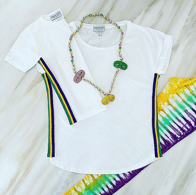 Custom Mardi Gras fabric sewn on a Next Level Women's Dolman